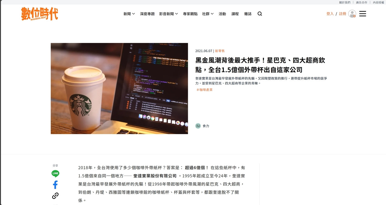 2018年,全台灣使用了多少個咖啡外帶紙杯?答案是: 超過6億個! 在這些紙杯中,有1.5億個來自同一個地方—— 奎達實業股份有限公司 。1995年起成立至今24年,奎達實業是台灣最早發展外帶紙杯的先驅!從1998年帶起咖啡外帶風潮的星巴克、四大超商,到伯朗、丹堤、西雅圖等連鎖咖啡館的咖啡紙杯、杯蓋與杯套等,都跟奎達脫不了關係。......<閱讀更多>